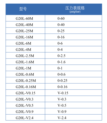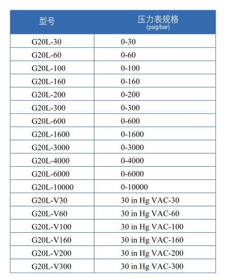 產品說明:G20系列壓力表主要使用于減壓器及管路系統壓力顯示,壓力表規格為2",進氣螺紋為1/4"NPT,壓力表精度為2.5級,3-2-3 %。材質:316L(與介質接觸部分)